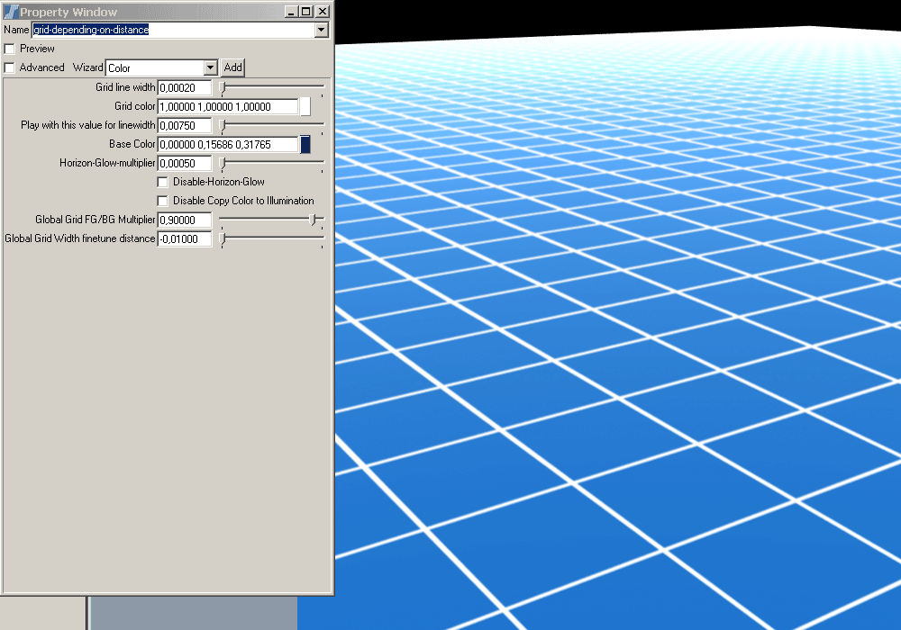 A scene with a grid shader (useful in stills). Grids linewidth depends on distance to camera.